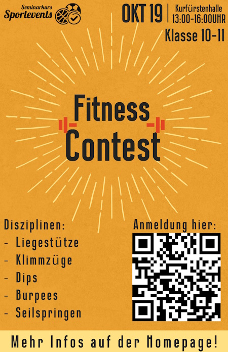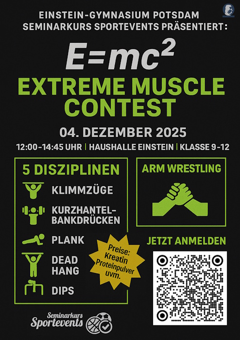 Am Donnerstag, dem 4. Dezember 2025, wird’s laut in der Haushalle des Einstein-Gymnasiums: Der Seminarkurs Sportevents präsentiert den „E = mc² – Extreme Muscle Contest“ – unser Fitness-Event für die Jahrgangsstufen 9 bis 12 in der Zeit von 12:00 Uhr bis 14:45 Uhr.