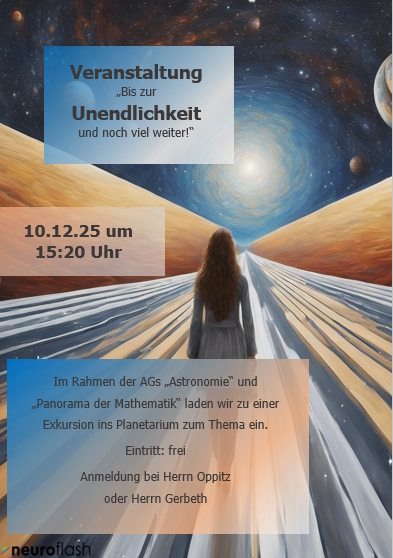 Am Tag selbst beginnt der Empfang aller Teilnehmenden um 15 Uhr auf dem Schulhof. Eine Informationsveranstaltung für alle Eltern startet parallel ab 16:45 Uhr in der Schulaula. Unser zweiter Schnuppernachmittag "MINT" (Mathematik, Informatik, Naturwissenschaften und Technik) findet am Dienstag, den 13. Januar 2026, statt (Anmeldung folgt).