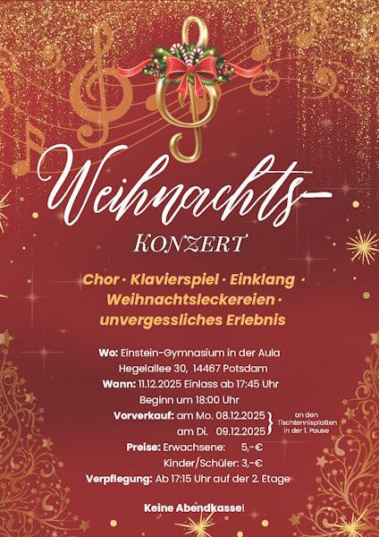 Am 11. Dezember 2025 laden wir herzlich zu unserem Weihnachtskonzert in die Aula des Einstein-Gymnasiums ein. Der Einlass beginnt um 17:45 Uhr und um 18:00 Uhr startet das Programm mit festlicher Musik sowie einer gemütlichen, vorweihnachtlichen Atmosphäre.