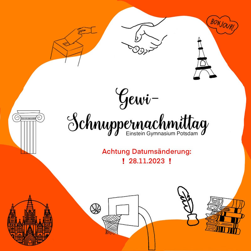 Liebe GrundschülerInnen, werte Eltern, in bewährter Tradition veranstaltet das Einstein-Gymnasium Potsdam auch in diesem Schuljahr zwei Schnuppernachmittage um den potenziellen Siebtklässlern einen Einblick in die Fächer und deren Inhalt zu geben. Der erste Schnuppernachmittag "GeWi" umfasst die Fächer der Gesellschaftswissenschaften und findet am Dienstag, den 14. Oktober 2025, statt (Anmeldung über diesen Link).