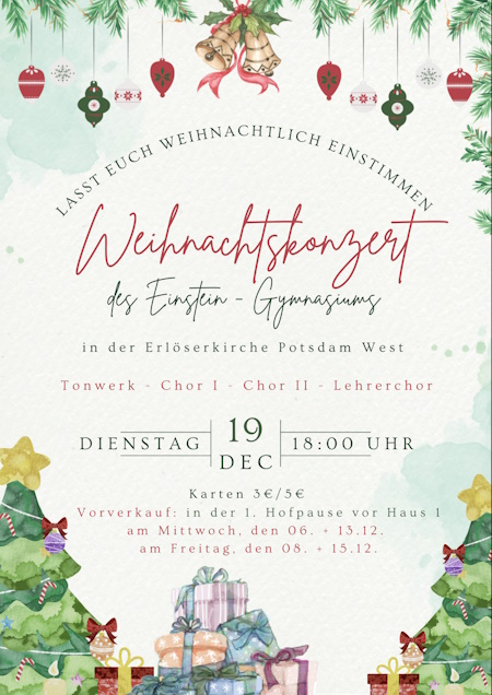 Am 11. Dezember 2025 fand unser Weihnachtskonzert in der Aula des Einstein-Gymnasiums statt. Um 18:00 Uhr startete das Programm mit festlicher Musik in einer gemütlichen und vorweihnachtlichen Atmosphäre.