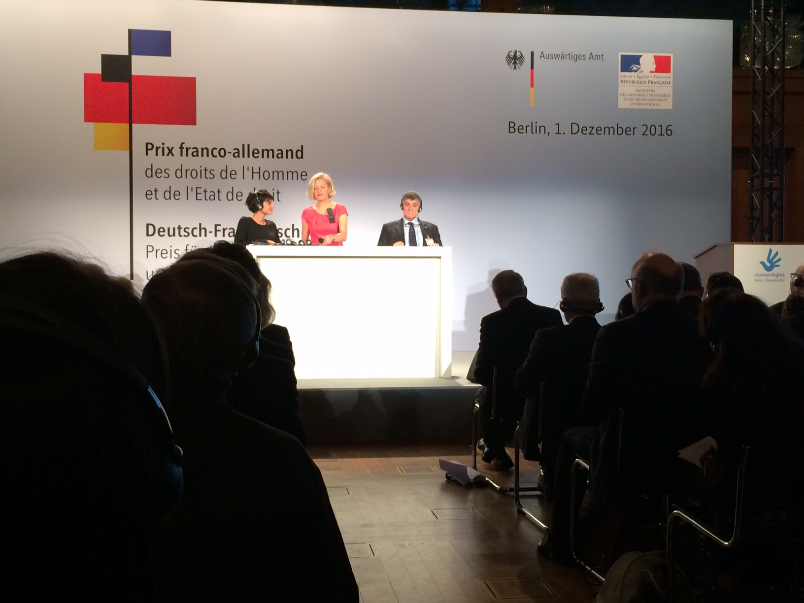 Die Außenminister beider Länder, Frank-Walter Steinmeier und Jean-Marc Ayrault, würdigten in ihren Reden das Engagement der Preisträger, die z.B. in Jordanien, Pakistan, Afrika, aber auch in Kanada, China oder Brasilien für die Einhaltung der Menschenrechte und Rechtsstaatlichkeit in ihren Ländern kämpfen und dabei z.T. ihr Leben riskieren oder zumindest großen Repressalien ausgesetzt sind.