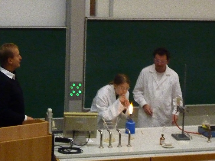 Zusätzlich war auch die Universitätsband anwesend, die den Vortrag mit so etwas ähnlichem wie Musik untermalt hat. Im zweistündigen Vortrag mit beeindruckenden Experimenten loderten bunte Flammen auf, Ballons mit Knallgas explodierten, eine Flamme wanderte einen Schlauch hinauf, Trockeneis wurde zum Leuchten gebracht und vieles mehr. Sogar zwei Jungen aus der Klasse 8b haben sich getraut, Trockeneis in eine gefärbte Flüssigkeit zu geben. Die Farbe änderte sich und Nebel stieg auf. Am Schluss kam der Weihnachtsmann, der uns mit Süßigkeiten beworfen hat. Alles in allem war der Spätnachmittag sehr unterhaltsam.