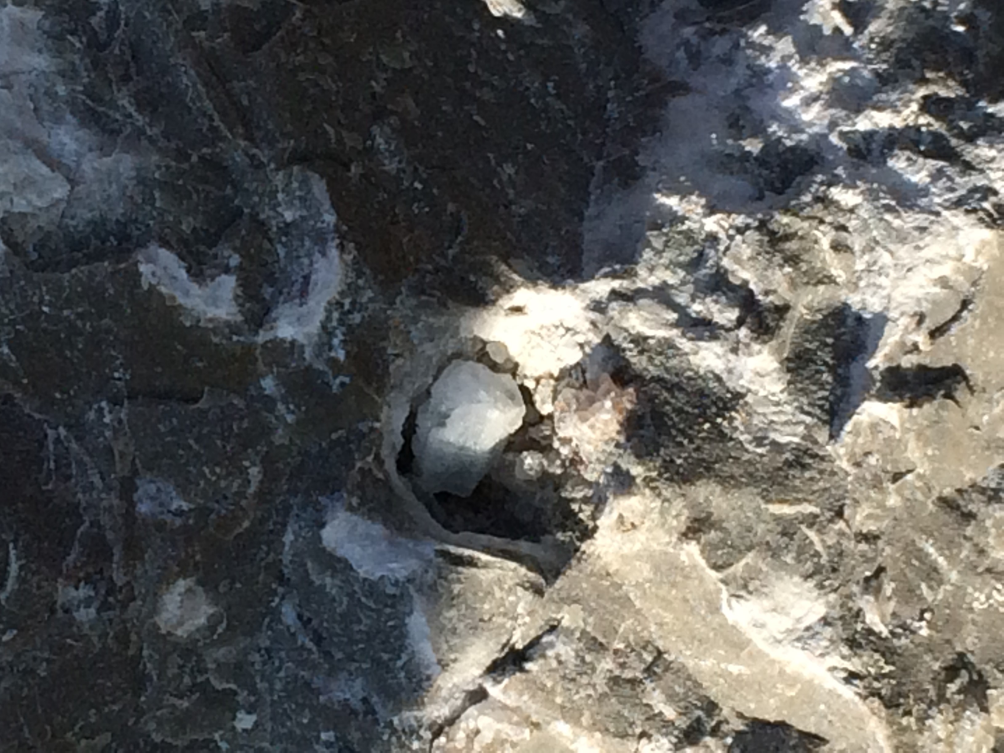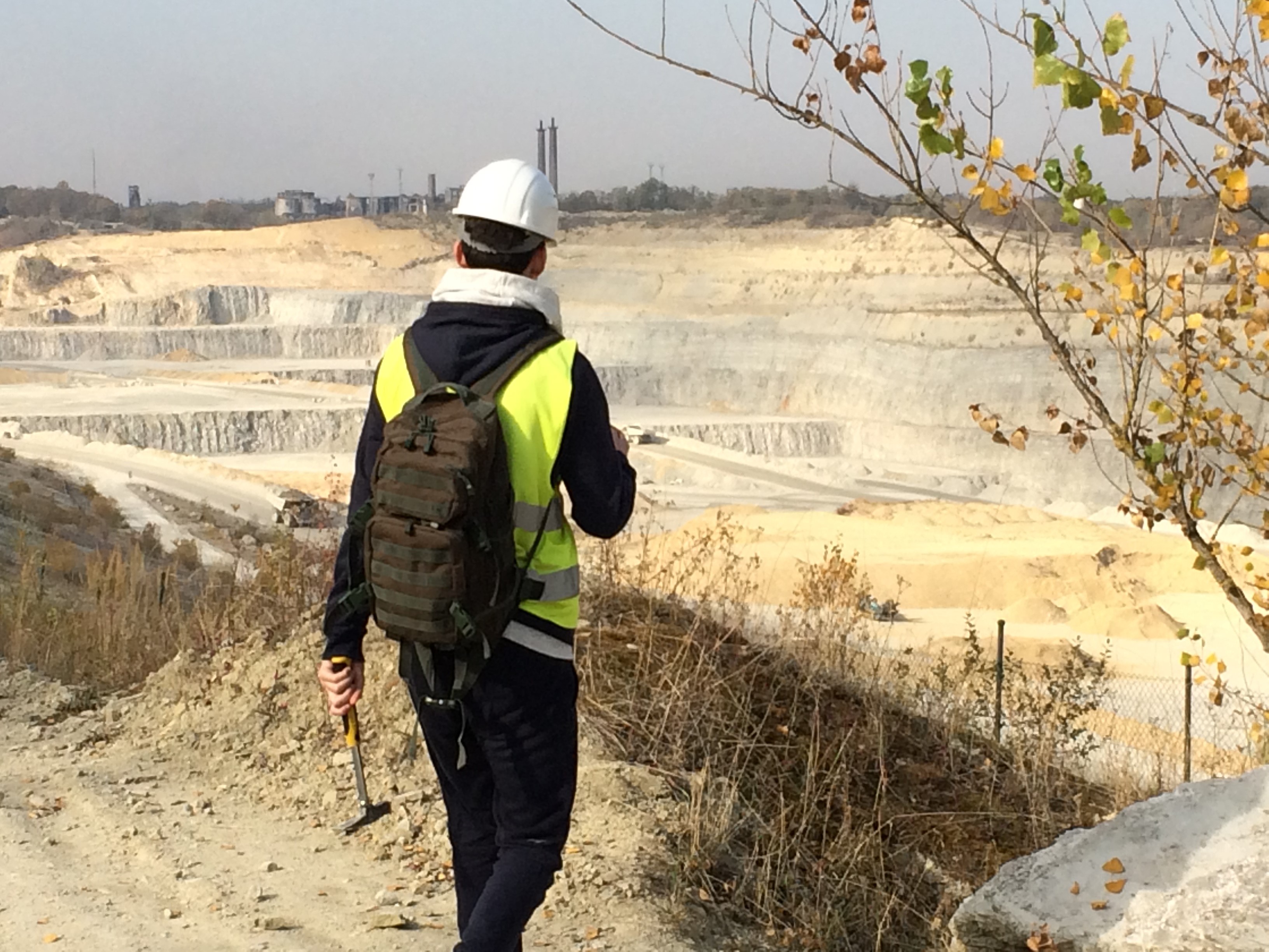 Nachdem wir Helme, Schutzbrillen und sogar Warnwesten angezogen hatten, fuhren wir mit zwei Jeeps in einen bestimmten Teil des Steinbruches. Dort konnten wir mit Geologenhämmern auf die Suche nach Fossilien und Mineralien gehen. Fossilien fanden wir zwar nicht, dafür aber einen schönen Kristall.