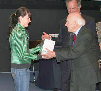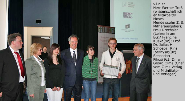 Dazu wurden wir, Schüler der Klasse 9c des Potsdamer Einstein-Gymnasiums, eingeladen, um die erste Kassette in Empfang zu nehmen. Es war für uns eine große Ehre, die Bände aus den Händen des Zeitzeugen Hans Keilson überreicht zu bekommen. Als Herr Keilson von seinen Erlebnissen aus dieser Zeit und von diesem schrecklichen Tag der Bücherverbrennung dem 10. Mai 1933 berichtete, waren wir sehr berührt und zugleich betroffen.