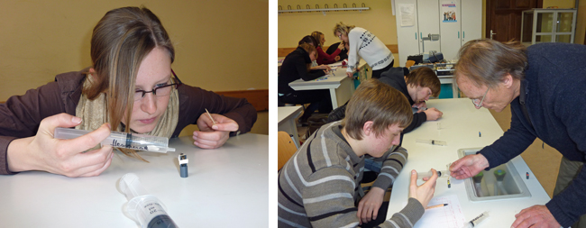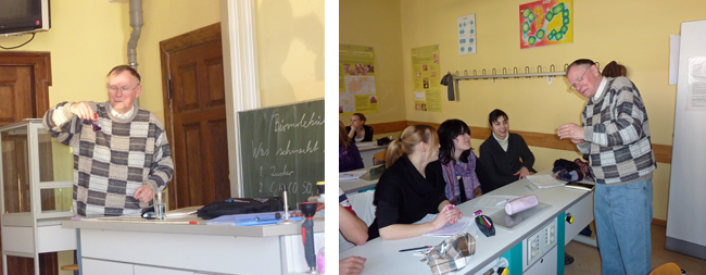 In diesem Jahr stand der experimentelle Biologieunterricht im Mittelpunkt des Vortrages von Herrn Prof. Menzel. Dazu hatte er Bienen mitgebracht, die im Schülerexperiment etwas assoziativ Lernen sollten. Ein primärer, zunächst neutraler Reiz, ein Duft, z.B. Linalool, wurde verknüpft mit einem sekundären Reiz, einer Zuckerlösung, bei dem die Biene ihren Rüssel ausstreckte. Wenige Wiederholungen genügten und die Biene streckte ihren Rüssel bereits bei Duftzufuhr ohne anschließende Gabe der Zuckerlösung aus. Anschließend begaben sich die Schüler auf die Suche nach den Gedächtnisspuren bei den Bienen. Dabei half Herr Prof. Menzel, in dem er seine Erklärungen mit beeindruckenden Aufnahmen von miteinander kommunizierenden Neuronen und von abgeleiteten Aktionspotenzialen zeigte.