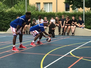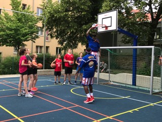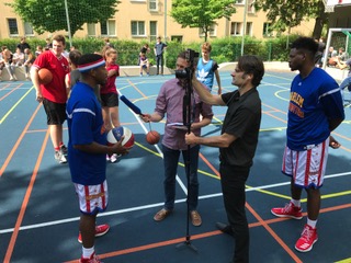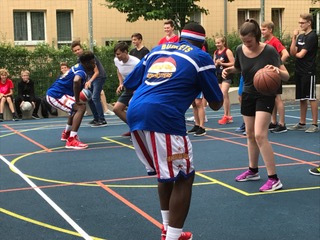 Spider und Buckets aus der weltbekannten Basketball-Showgruppe der Harlem Globetrotters aus den USA waren am Mittwoch, den 5. Juli 2017, bei uns zu Gast am Einstein-Gymnasium und übernahmen mal eben den Sportunterricht. Hier geht es zum Bericht der MAZ.
