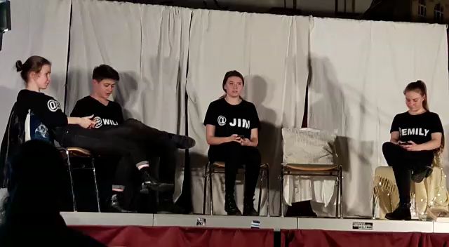 Während bei vielen lustigen Dialogen und kleineren Stücken viel gelacht wurde, behandelten fünf Schauspieler aus Frau Mahlings Kurs auch mehrere ernste Themen. Neben Mobbing und Magersucht thematisierte das Stück „Chatroom“ nach Enda Walsh auch Selbstmord und Depressionen.