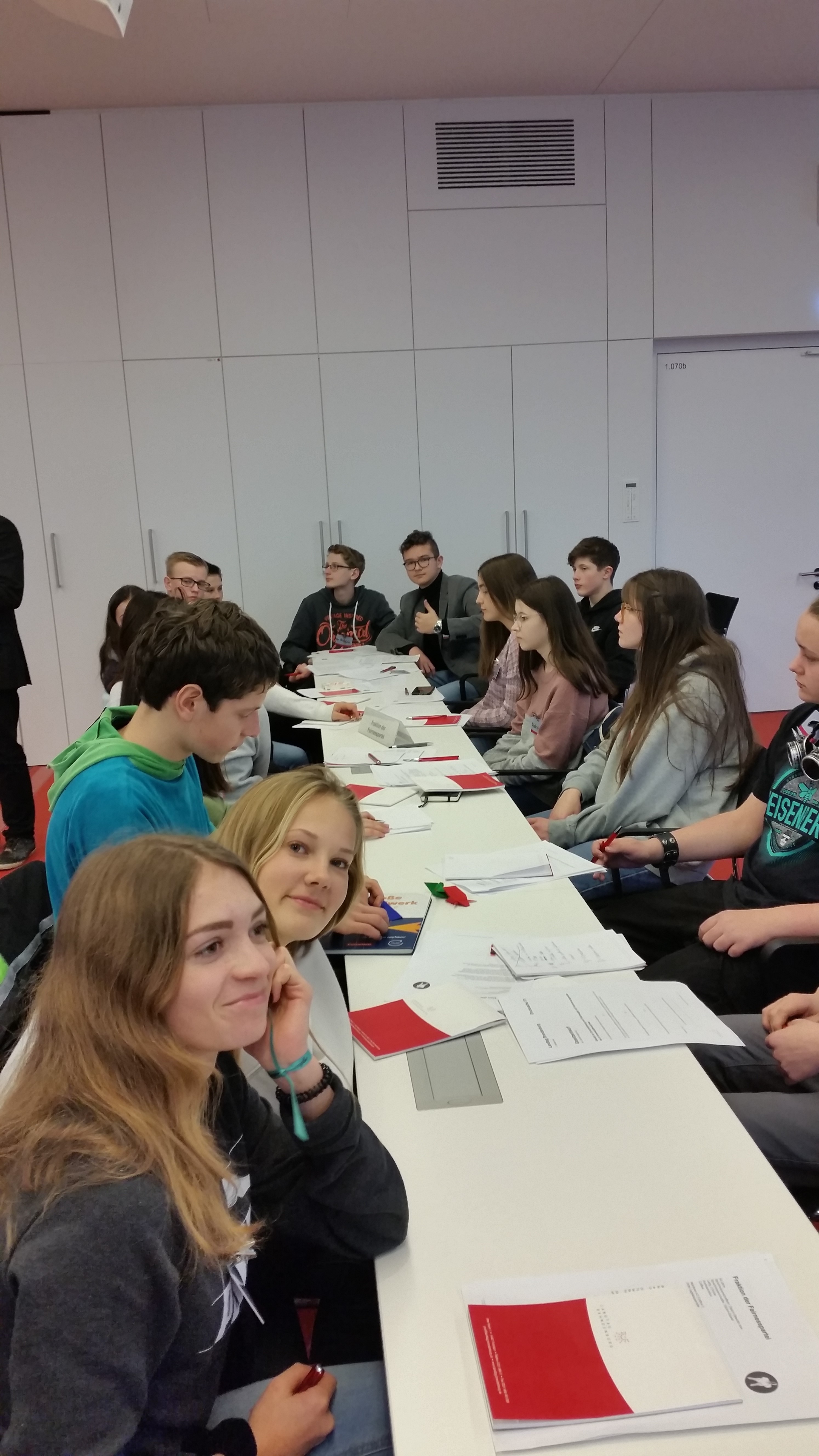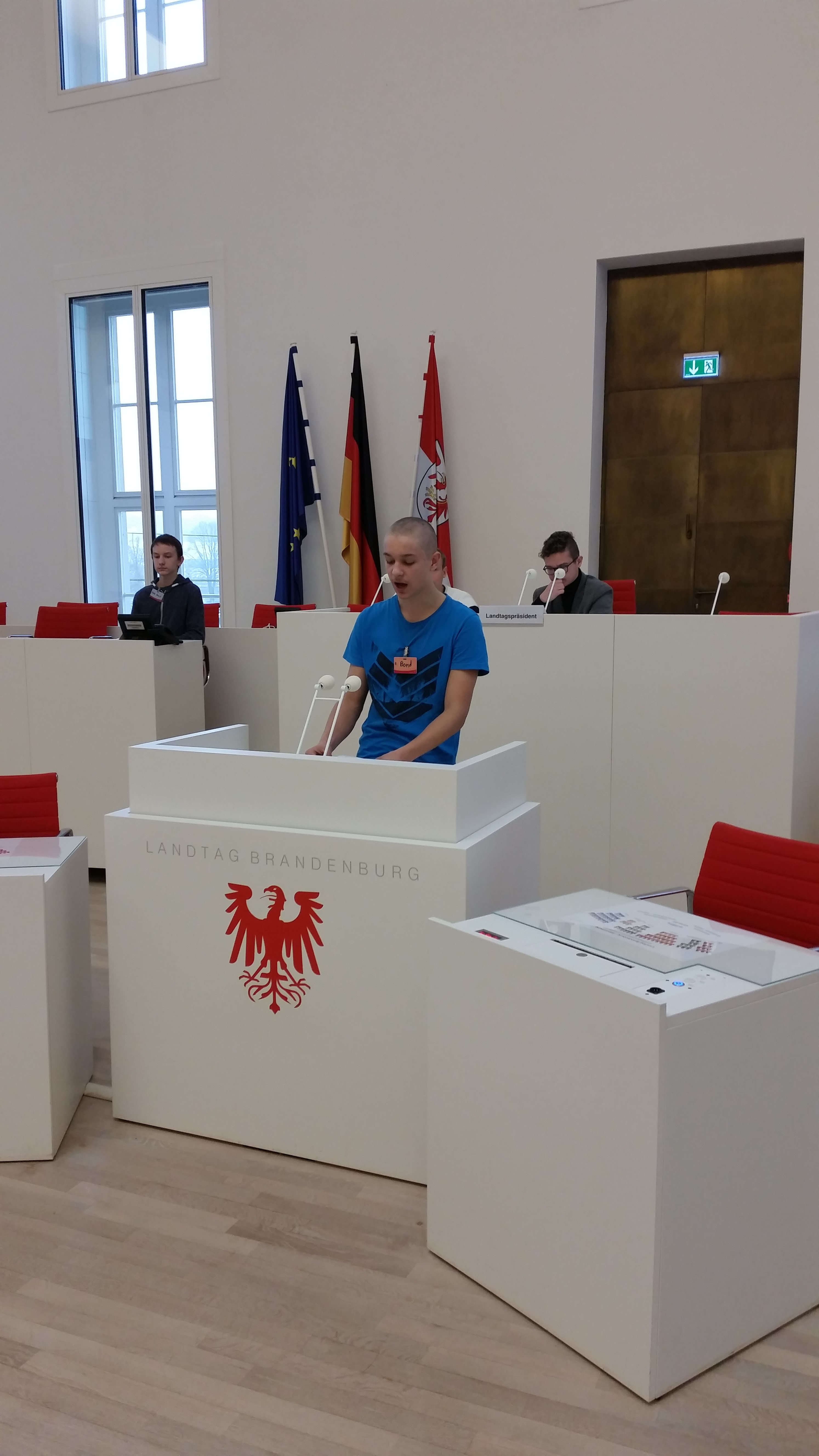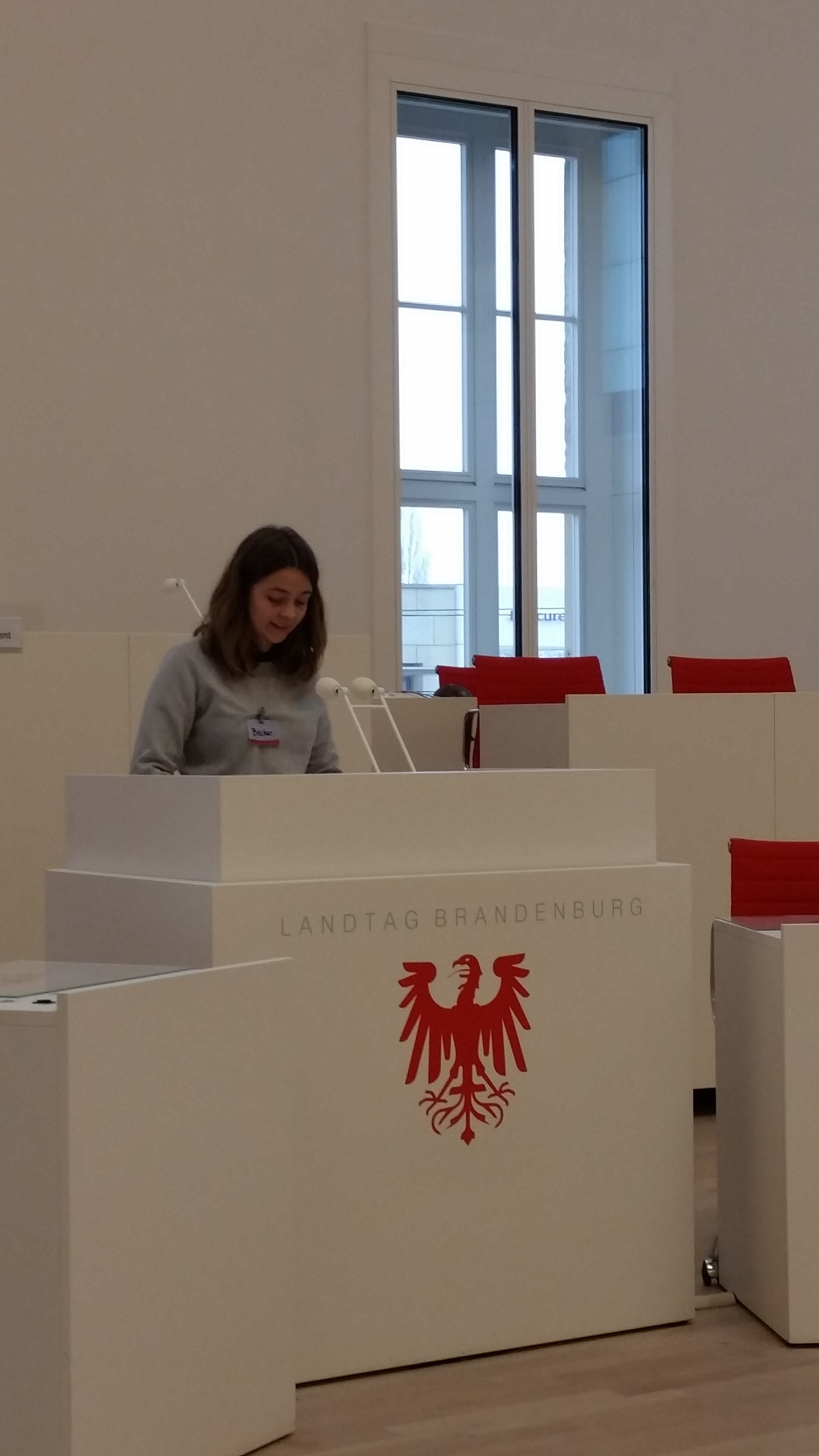 Am Montag, den 25.11.2019, nutzten wir, die Schülerinnen und Schüler der 9c und 9d, im Zuge einer Exkursion die Chance im Landtag an einem Planspiel zum Thema „Sollen die Städte im Land Brandenburg autofrei werden?“ teilzunehmen. Wir wurden zufällig in fiktive Parteien gelost und konnten in unseren Fraktionen im Plenarsaal Platz nehmen.