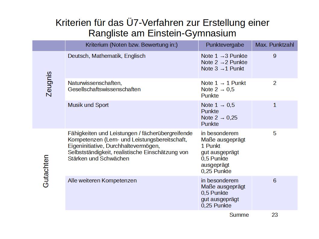 Bei Punktgleichheit wird der Gesamtnotendurchschnitt des Grundschulzeugnises zur Erstellung der Rangfolge einbezogen.