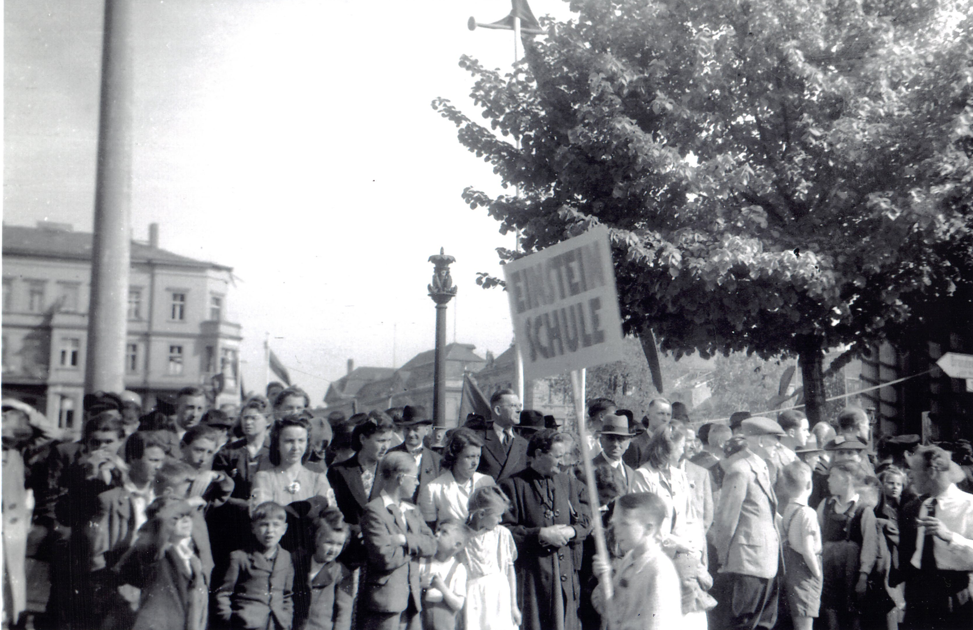 1. Mai 1946 auf dem "Brandenburger Platz" (ab 1951 "Platz der Nationen", heute, wie bis 1945, Luisenplatz im Hintergrund das Gebäude der "Einstein-Schule"